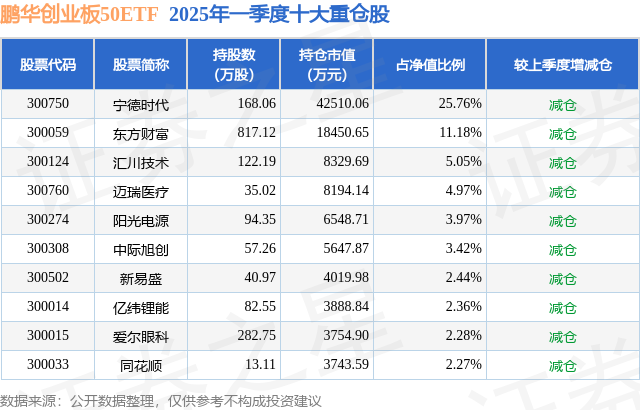 从基金规模来看,鹏华创业板50ETF基金2025年一季度公布的基金规模为16.5亿元,较上一期规模17.89亿元变化了-1.39亿元,环比变化了-7.79%。该基金最新一期资产配置为:股票占净值比99.22%,无债券类资产九五配资,现金占净值比0.79%。从基金持仓来看,该基金当季前十大股票仓位达63.7%,第一大重仓股为宁德时代(300750),持仓占比为25.76%。
