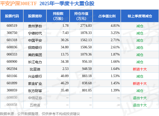 从基金规模来看天盈配,平安沪深300ETF基金2025年一季度公布的基金规模为5.77亿元,较上一期规模6.02亿元变化了-2504.61万元,环比变化了-4.16%。该基金最新一期资产配置为:股票占净值比98.87%,债券占净值比0.01%,现金占净值比1.2%。从基金持仓来看,该基金当季前十大股票仓位达22.92%,第一大重仓股为贵州茅台(600519),持仓占比为4.81%。